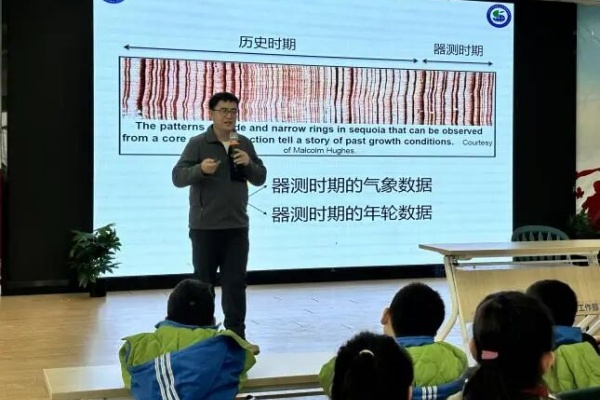 紧接着,由乌鲁木齐市科协邀请的中国科学院新疆生态与地理研究所副研究员买尔当・克依木博士带来“树木年轮—大自然的档案”主题讲座。博士结合自身研究经历,用生动语言讲解树木生长原理与年轮形成机制,分享树木年轮在古气候反演、生态系统研究中的应用,带领同学们探索树木年轮背后隐藏的自然奥秘。互动环节中,同学们踊跃提问,博士耐心解答,现场氛围热烈。